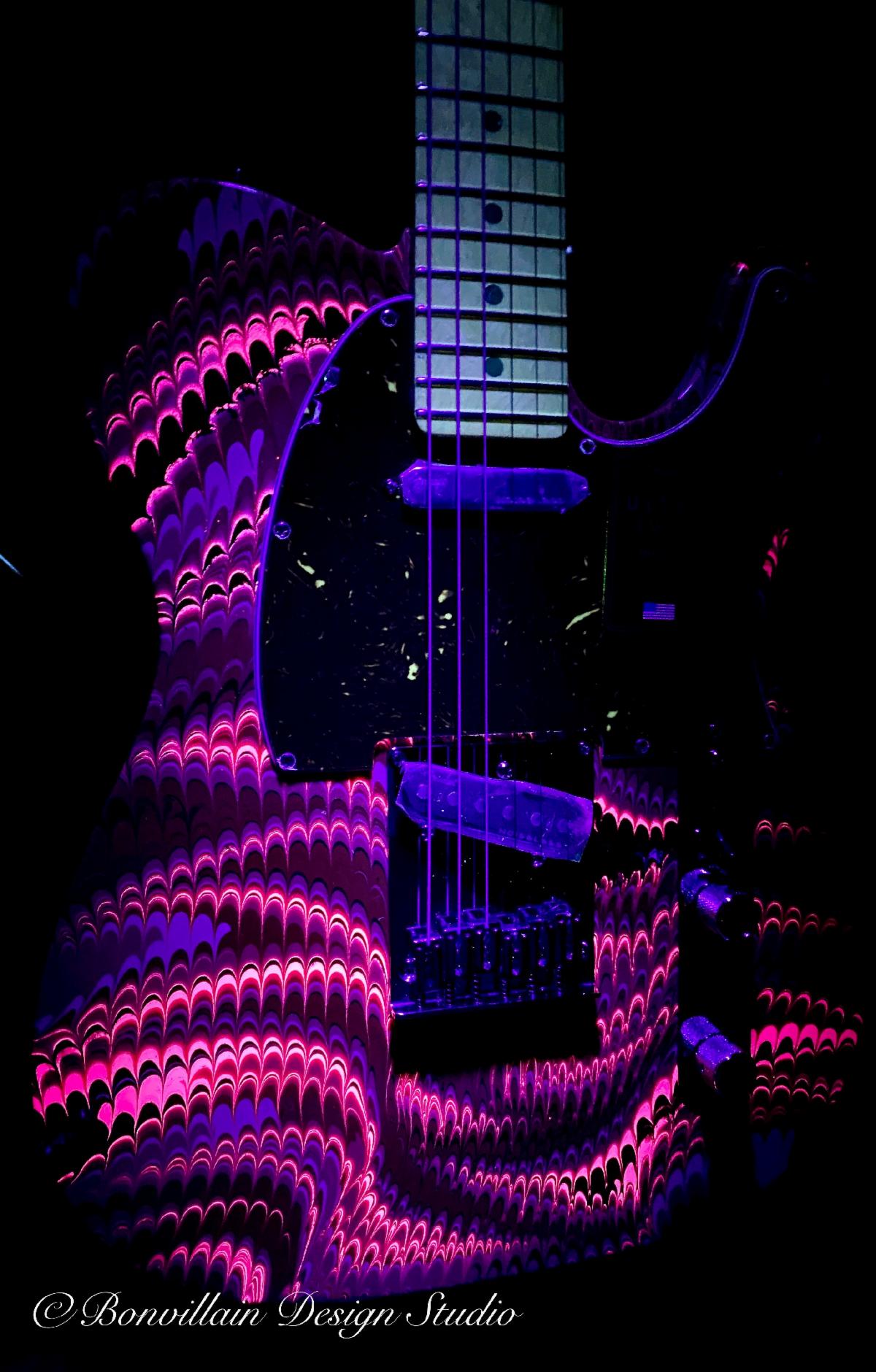 “I proceeded to spend hundreds of hours researching different techniques and learning about the chemistry of paints, pigments and chemical bonding to different surface substrates,”Bonvillain says.“I also spent thousands on different paints, and then hundreds of additional hours testing and painting different things before I felt like I was producing something close to what was in my head, which at that point had really changed from what the original swirls were into a kind of blend of old and new school designs with crazy colors and a lot of fluorescent pigments to make the guitars look insane when played on stage.”