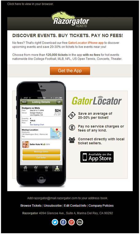 Razorgator, a leader in sports, music and theater ticketing, introduces GatorLocator, a free mobile app that provides event goers with a new way to buy and sell tickets to upcoming events.  GatorLocator enables fans to directly connect with local ticket sellers and purchase tickets without incurring any transaction or delivery fees.