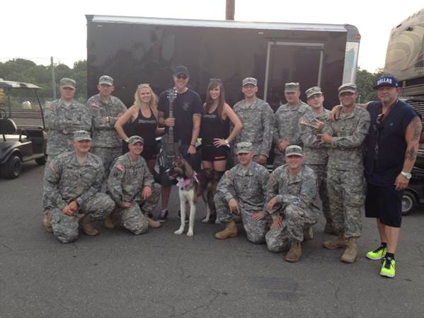 As mentioned above, each day Jägermeister and the ROCKSTAR ENERGY DRINK MAYHEM FESTIVAL presents the Metal of Honor award to a veteran in attendance. Every day, each veteran over the age of 21 with a Metal of Honor wristband receives a raffle ticket for a custom Metal of Honor/Jägermeister guitar to be presented to one of these hometown heroes on the main stage to thank them for their service. See below for a great photo from one of this weekend’s Metal of Honor moments!