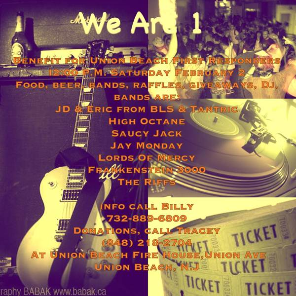 WE ARE 1, a benefit event for Union Beach first responders , will take place tomorrow, Saturday, February 2nd at 12:00PM at the Union Beach Fire House in Union Beach, NJ. The benefit will include performances by JD & Eric of Black Label Societyand Tantric, High Octane, Saucy Jack, Jay Monday, Lords of Mercy, Frankenstein 3000, and The Riffs.Food and drinks will be available at the benefit, plus there will be special raffles, giveaways, a DJ and more. To make donations, please call Tracey at 848-218-2704.